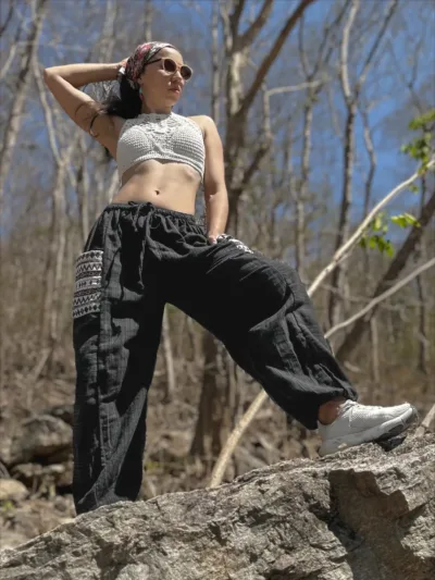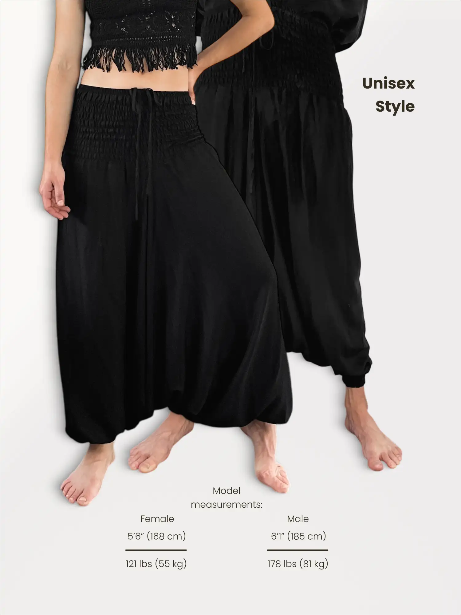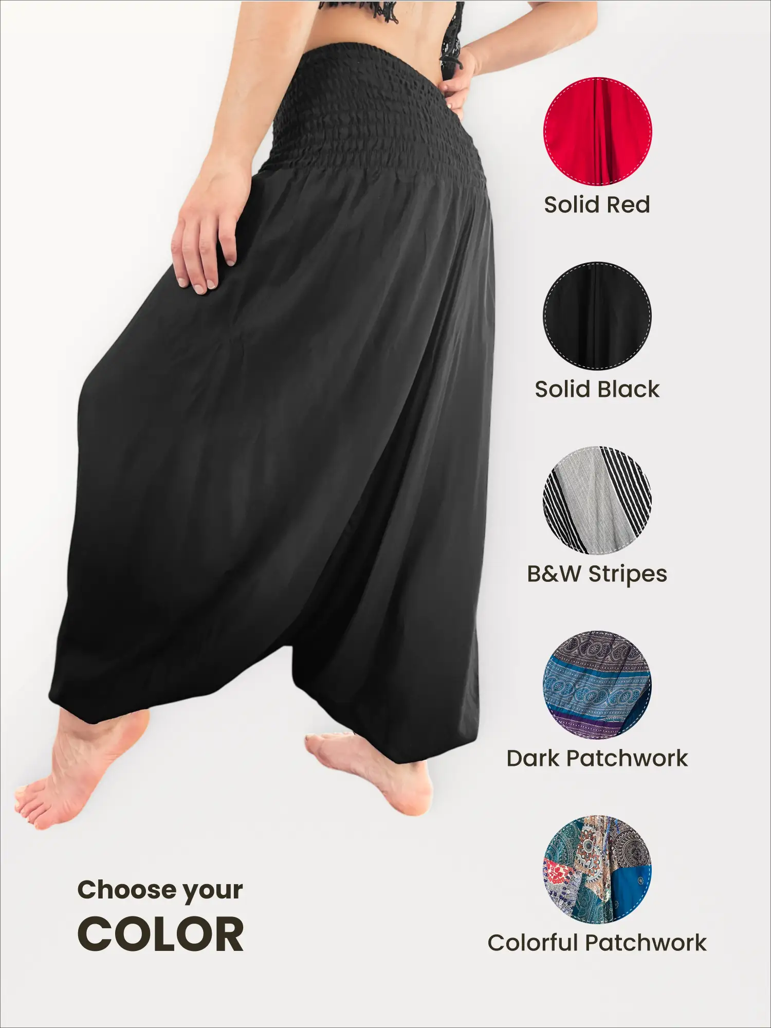 Embrace the power of timeless style with the Bohemium Aladdin Pants in Solid Black. This is the essential, must-have piece for any minimalist, dancer, or traveler. Made from luxuriously soft rayon, these pants feel incredible against the skin. The true magic lies in their adaptability. As seen in the photos, the wide, comfortable smocked waistband with drawstrings allows them to be worn as ultra-comfortable baggy trousers or pulled up to create a sleek, elegant halter-neck jumpsuit. It’s two incredible looks in one.