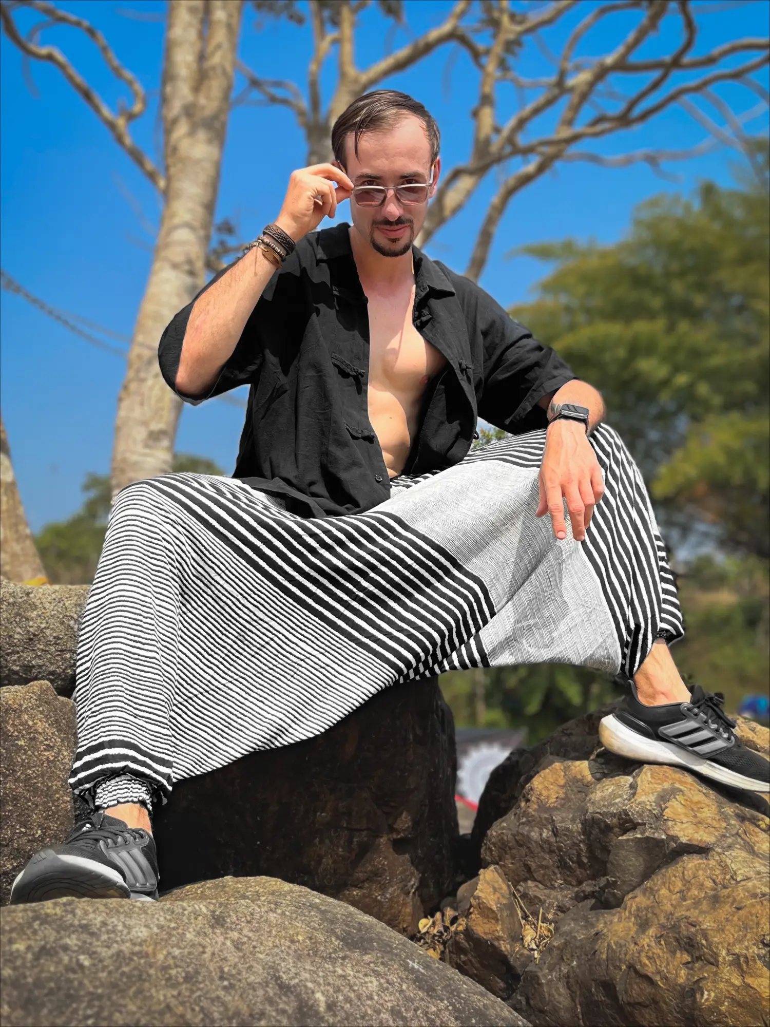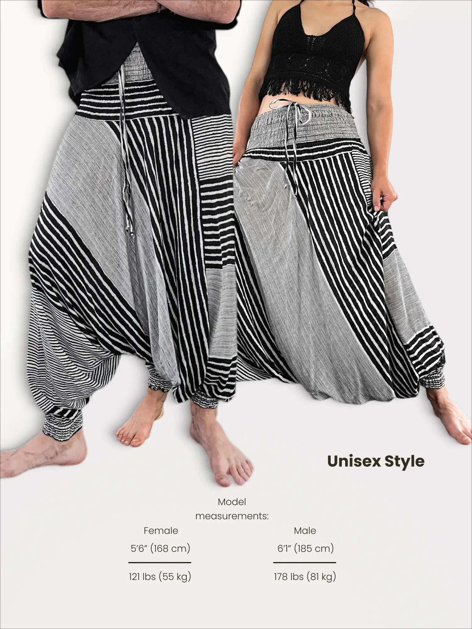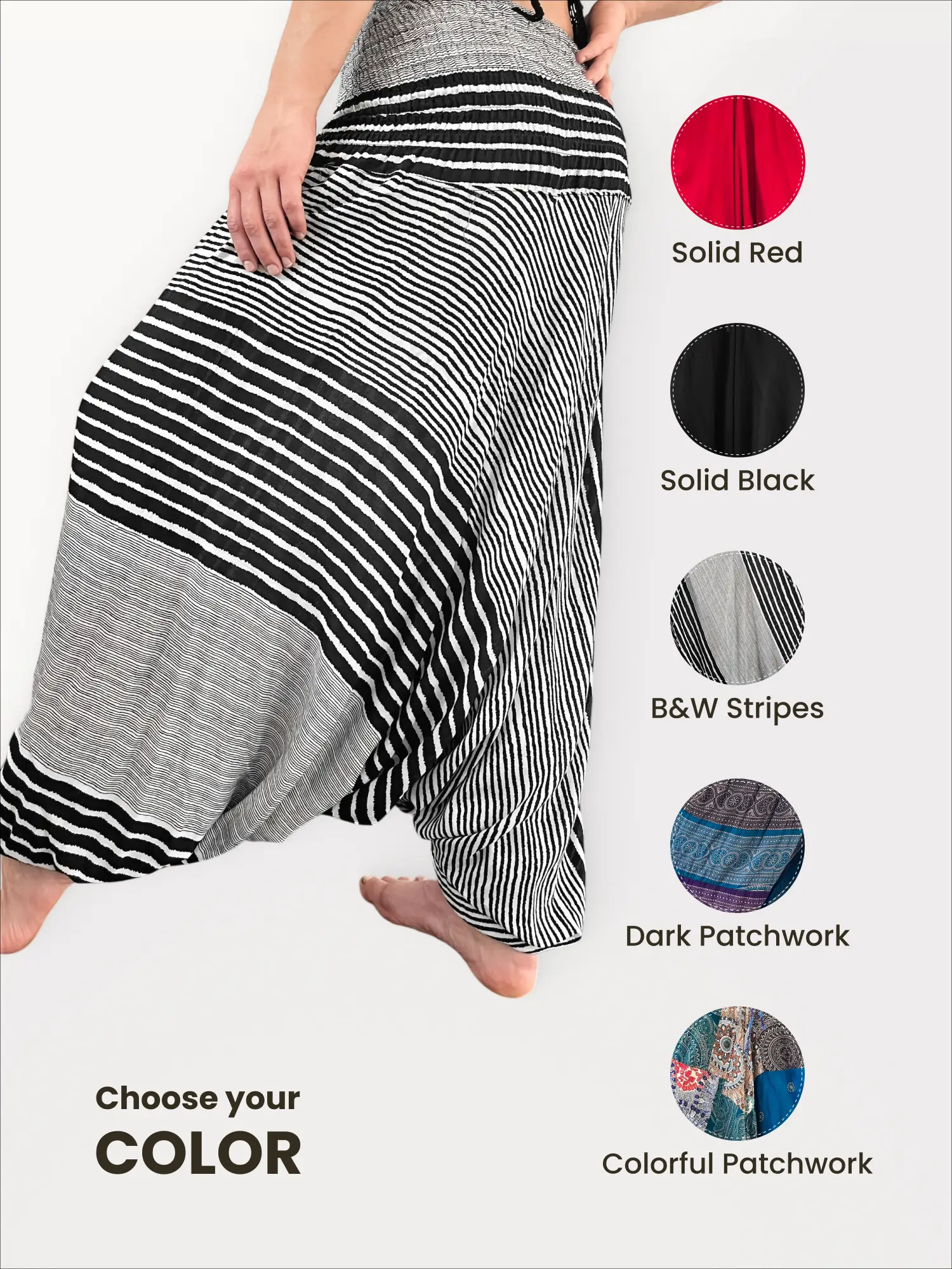 Stand out from the crowd with the Bohemium Aladdin Pants in a striking Black & White Stripes pattern. This graphic, high-contrast design is for the trendsetter and the creative soul who isn’t afraid to be seen. Handmade from soft, breathable rayon, their comfort is as impressive as their look. The innovative design features an extra-wide elastic waistband with a tie, allowing for a unique transformation: wear them as chic genie pants for your yoga practice, as shown in the graceful pose, or pull them up to create a breathtaking jumpsuit.