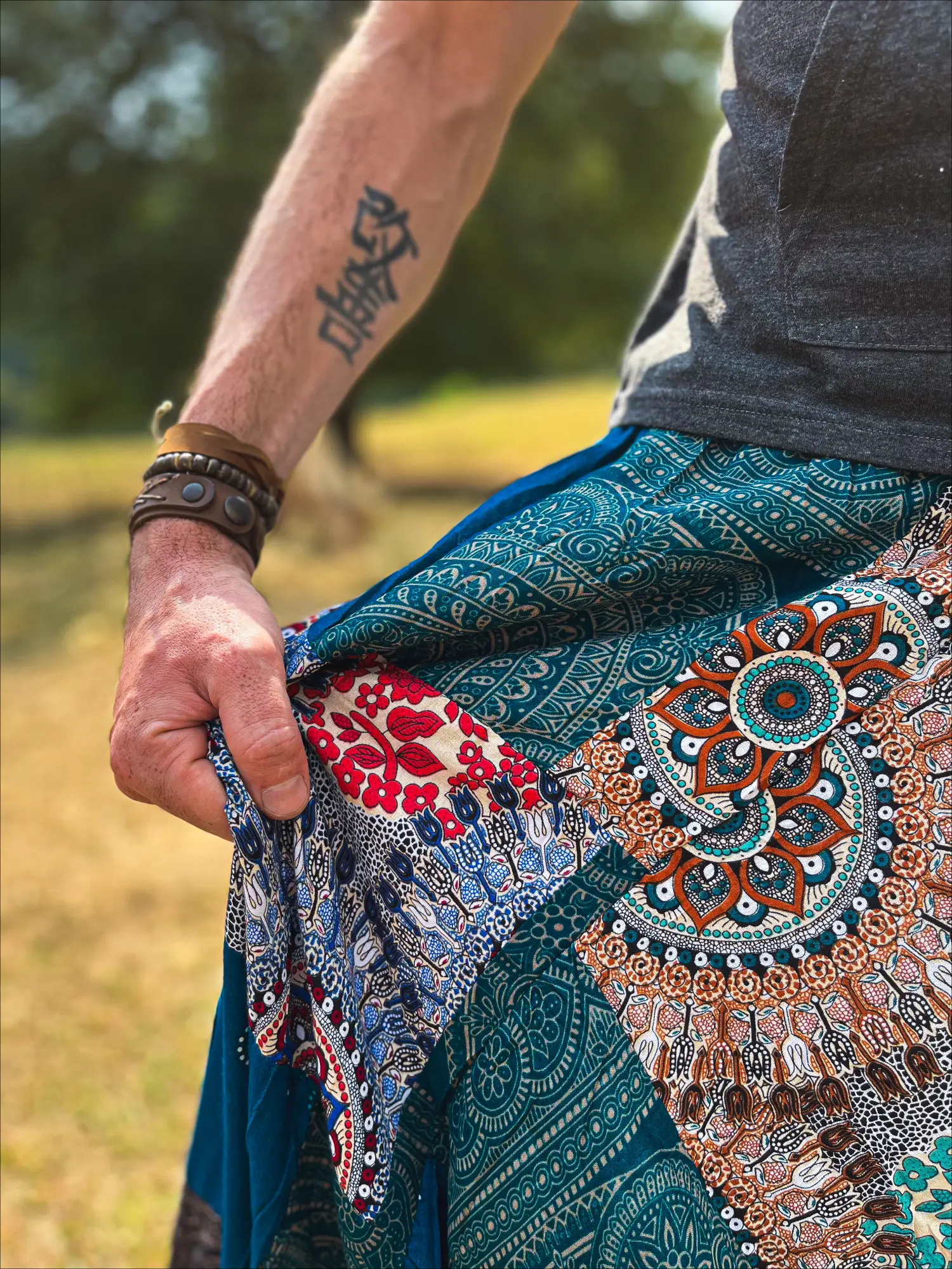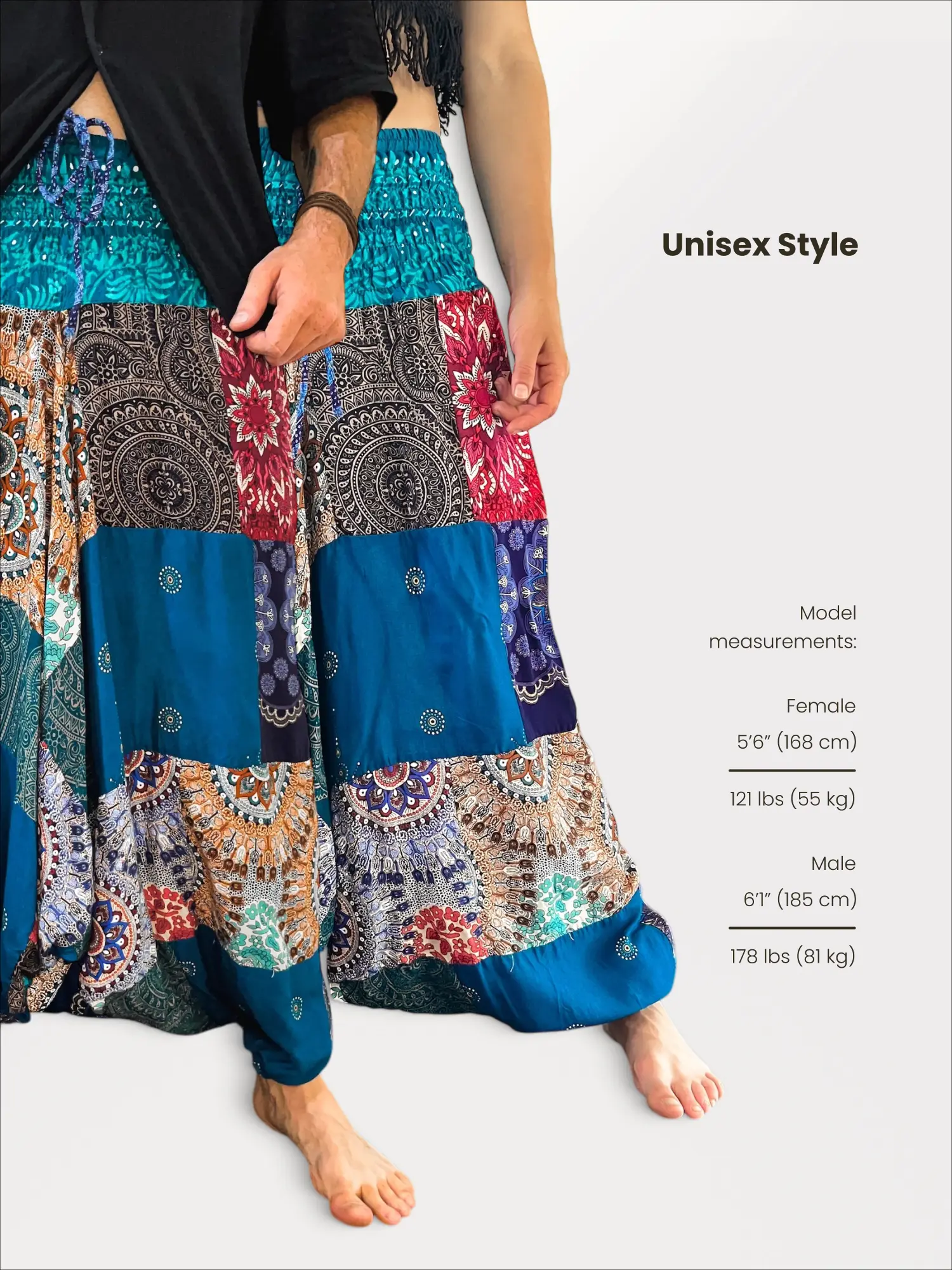 Wear a festival of colors with the Bohemium Aladdin Pants in our vibrant Colorful Patchwork design. As you can see from the photo, each pair is a joyful explosion of patterns and hues, handmade by piecing together different fabrics in shades of teal, red, and cream. These patchwork pants are a true celebration of life, perfect for the artist, the musician, and the free spirit. The soft rayon fabric feels amazing, while the super-stretchy, wide waistband with a tie offers incredible versatility. Wear them as eye-catching pants that flow with your every move, or pull them up to create a playful and comfortable jumpsuit.