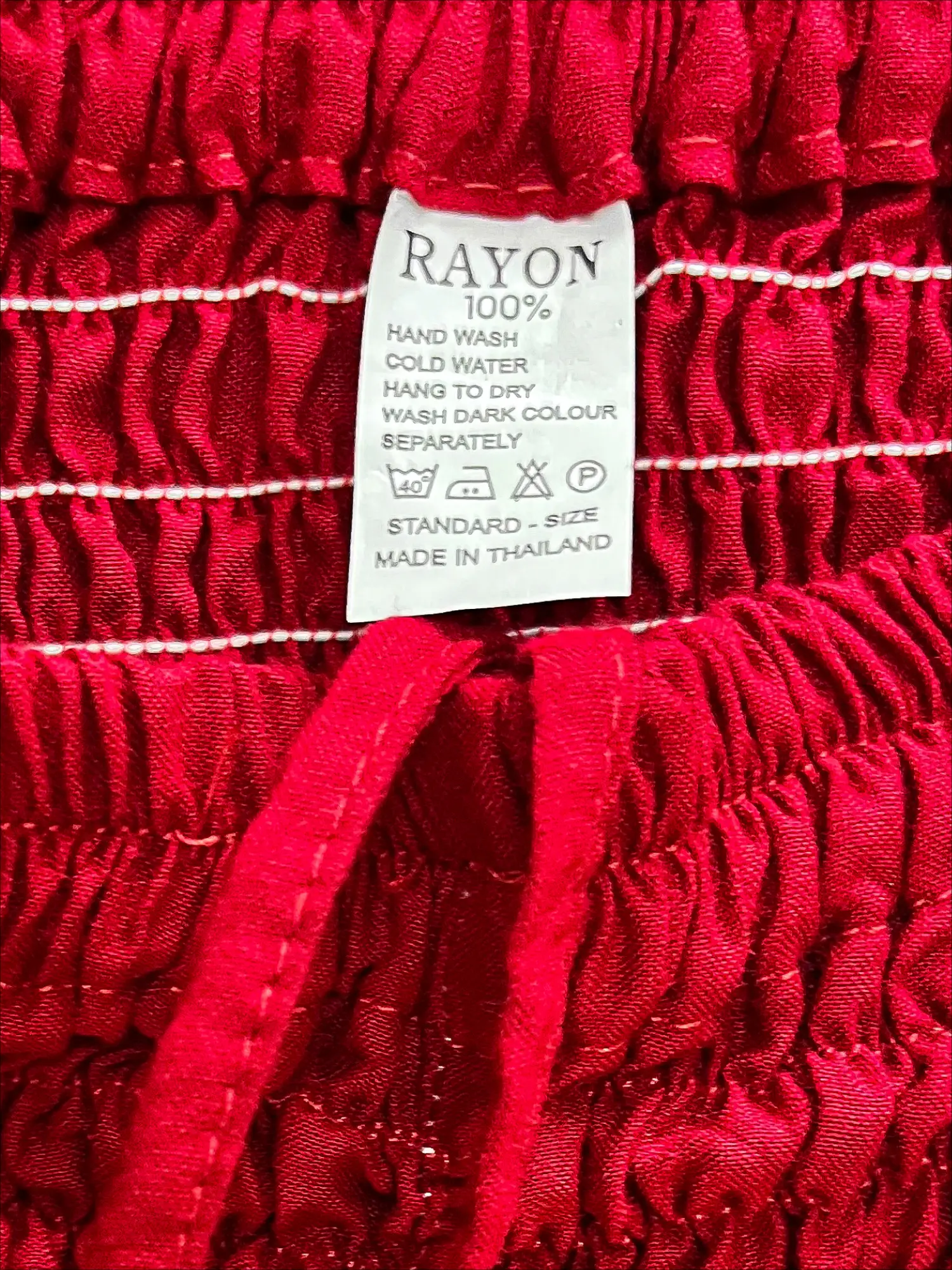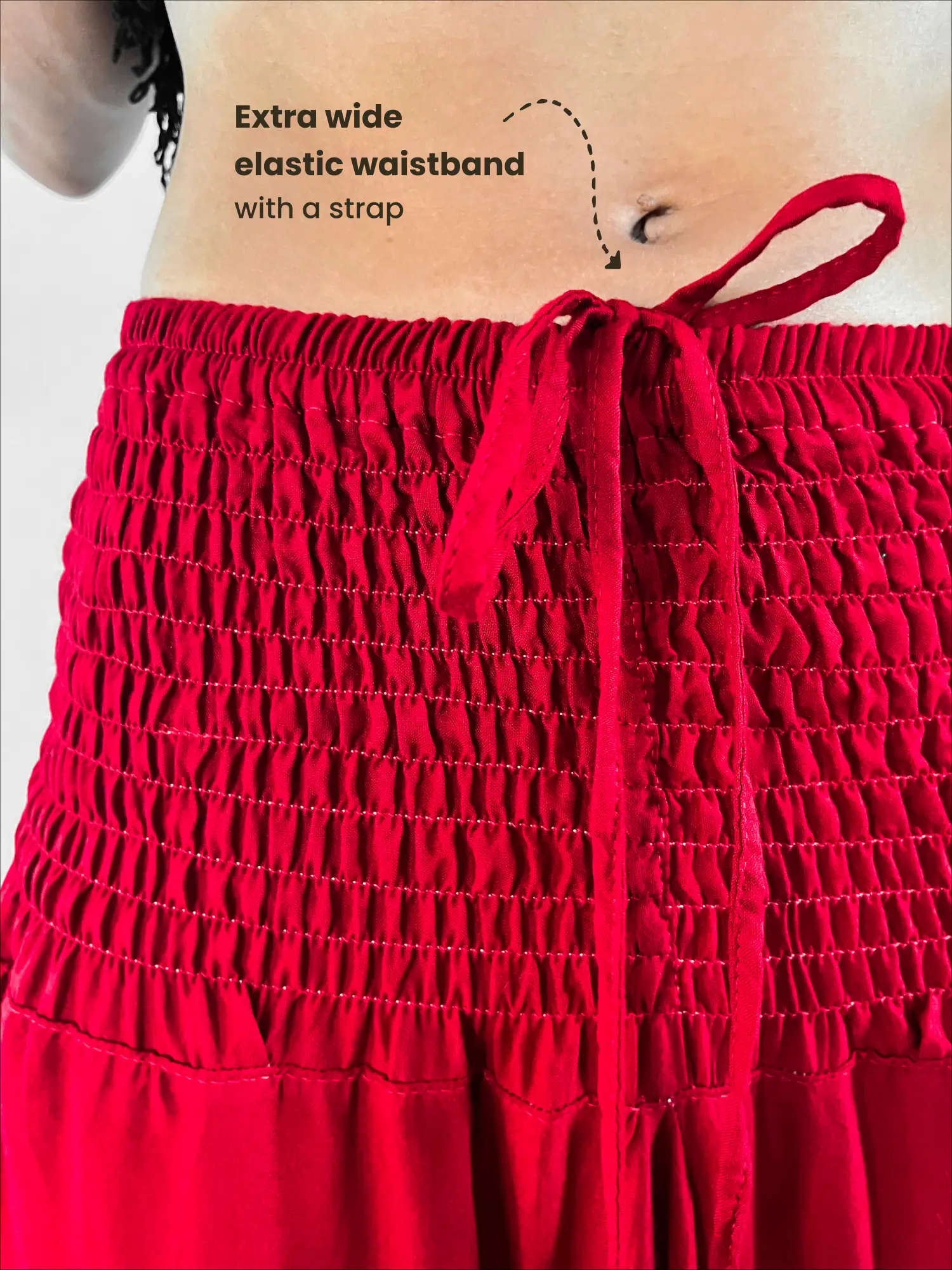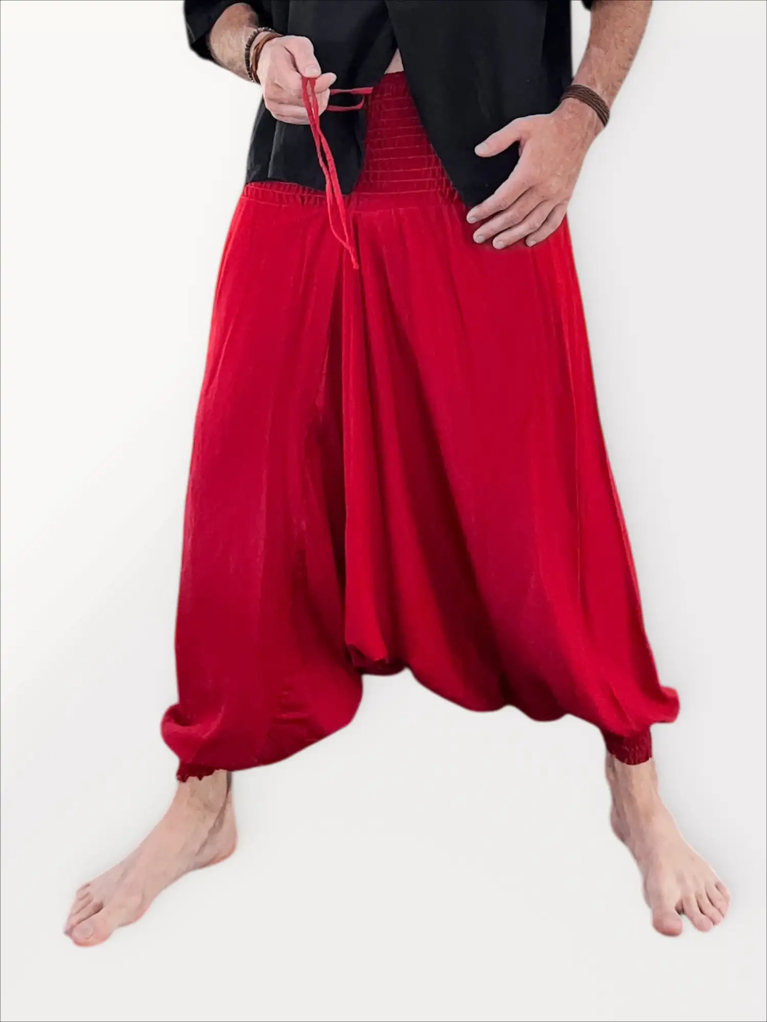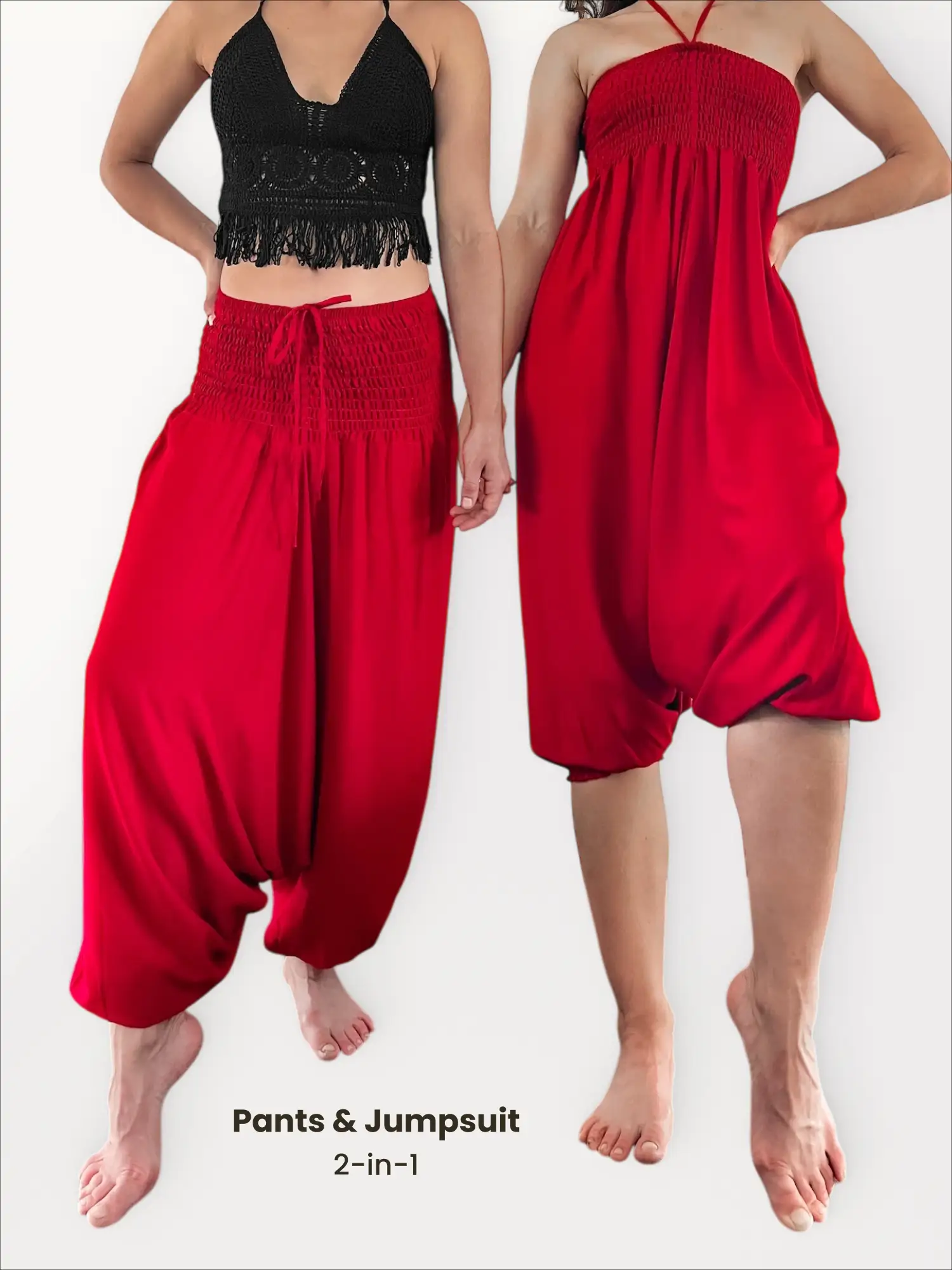 Feel the rhythm and express your passion with the Bohemium Aladdin Pants in a stunning Solid Red. This vibrant, energetic color is perfect for the bold artist and the fearless adventurer. Crafted from incredibly soft, flowing rayon, these pants offer a universe of comfort and freedom. The extra-wide smocked waistband with a drawstring is a game-changer: wear them as low-slung harem pants for that classic, roomy look, or pull the waistband up over the bust to instantly transform them into a stylish, comfortable jumpsuit!