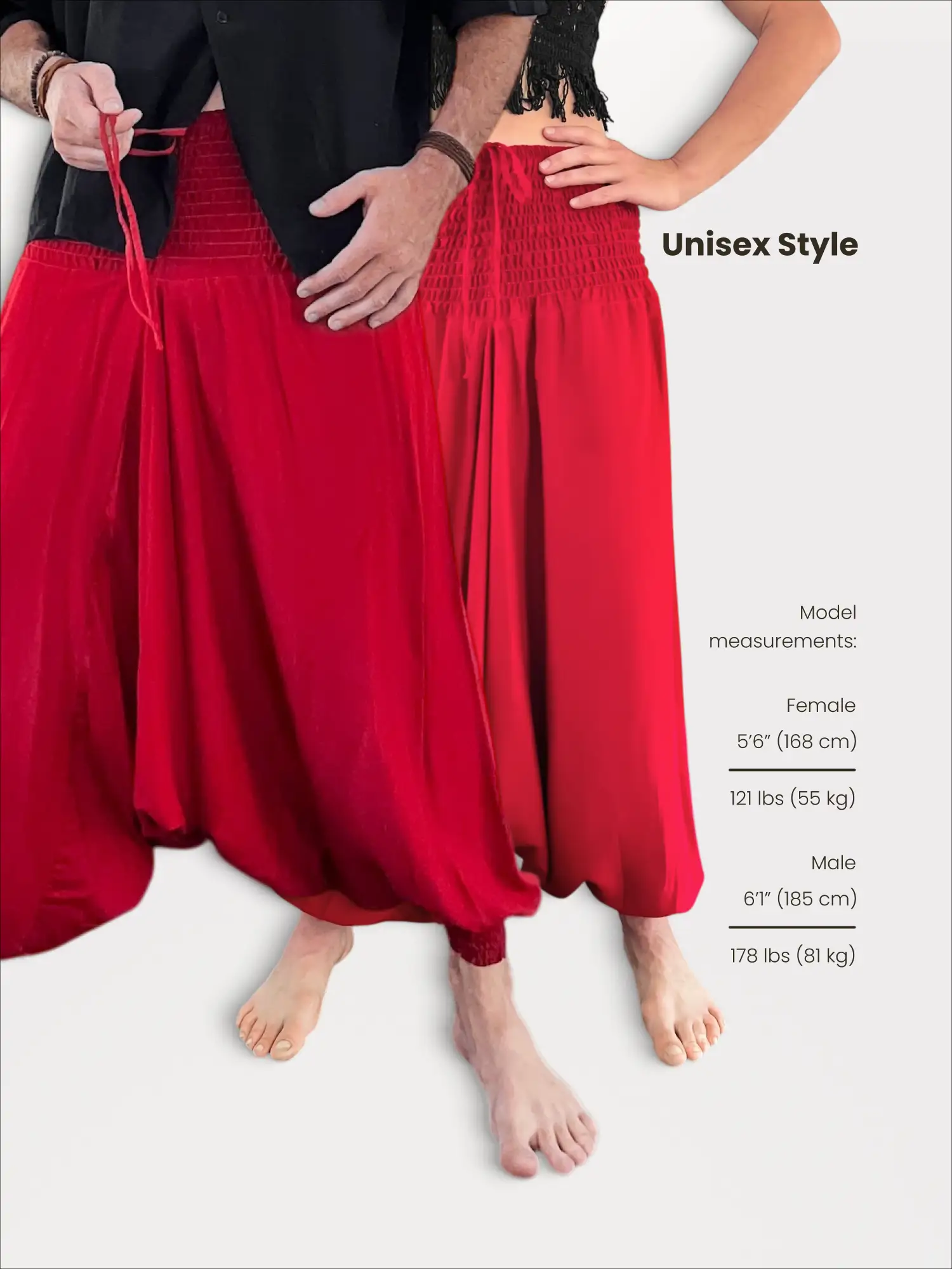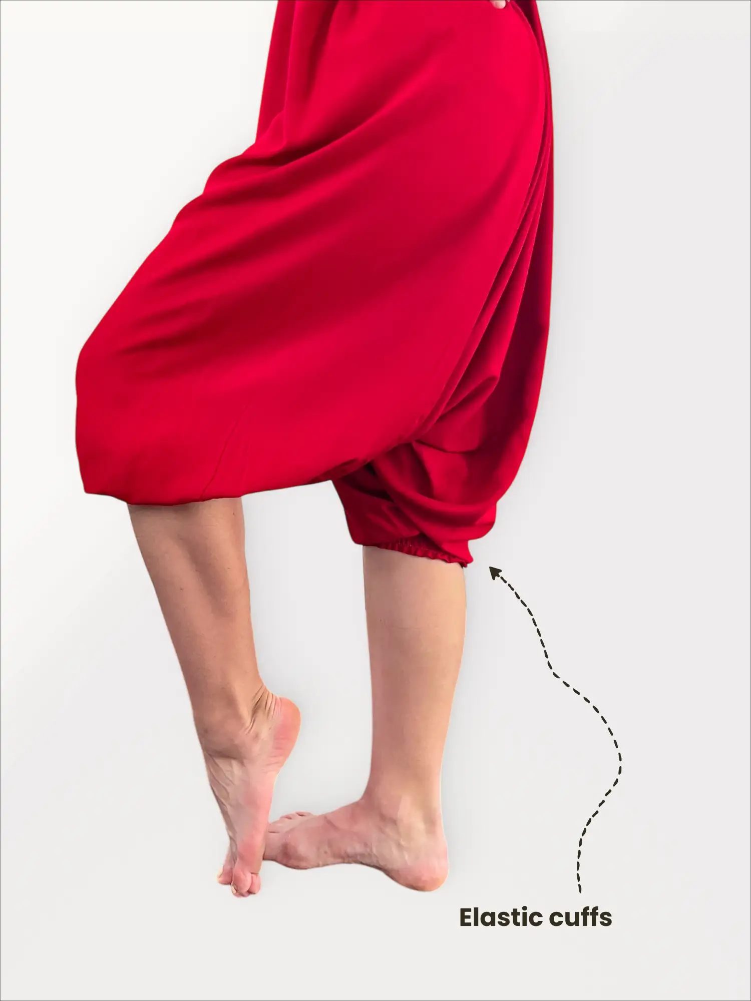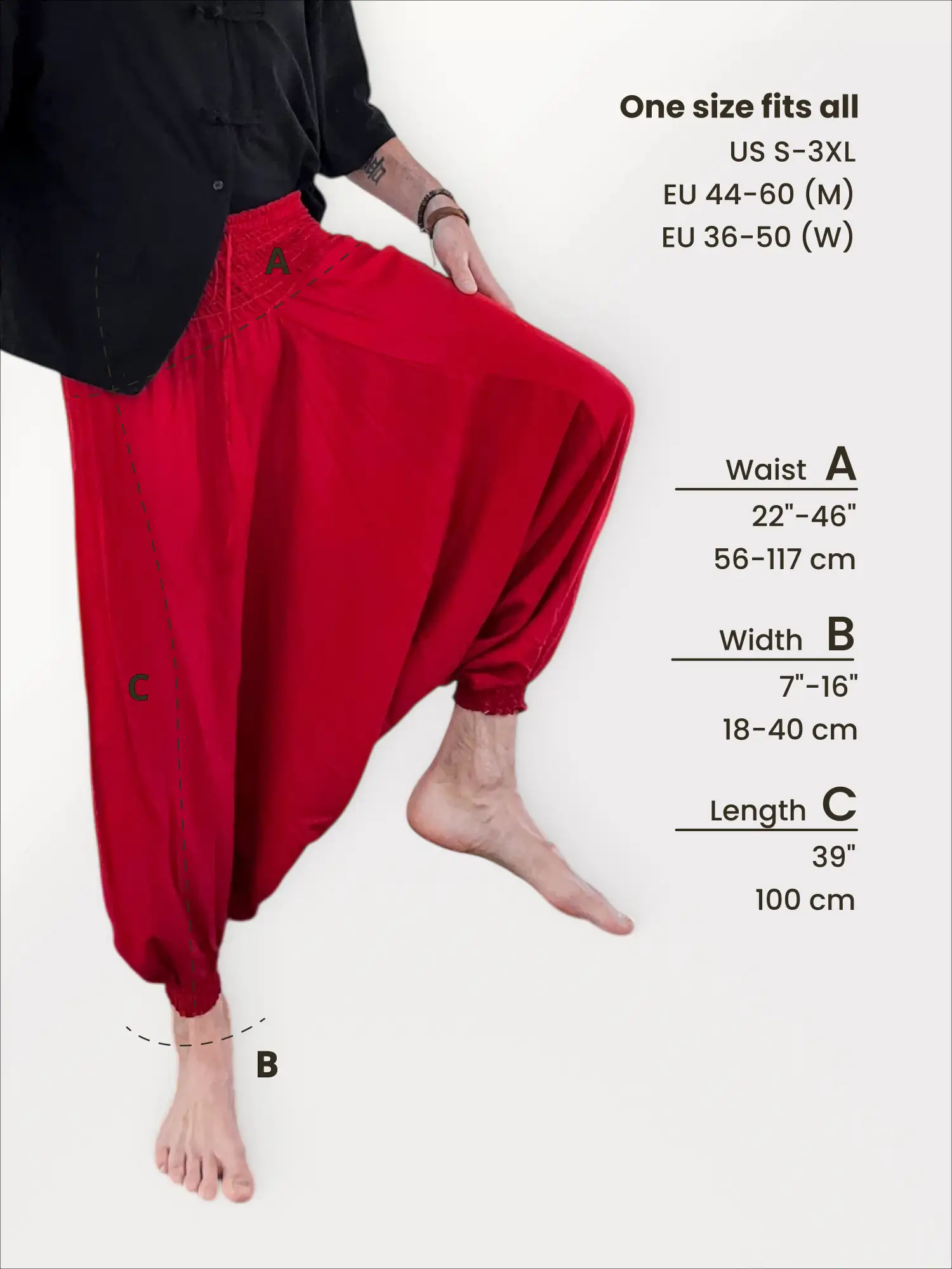 With their extremely spacious design and elastic cuffs, these pants are an absolute dream for dancers of all styles—from belly dance to contemporary—and provide the perfect, unrestricted fit for a deep yoga practice. They are the ultimate piece of versatile, unisex harem clothing. The one-size design fits a height range of 5’3″ to 6’3″ (approx. 160-190 cm), inviting everyone to play with their style.