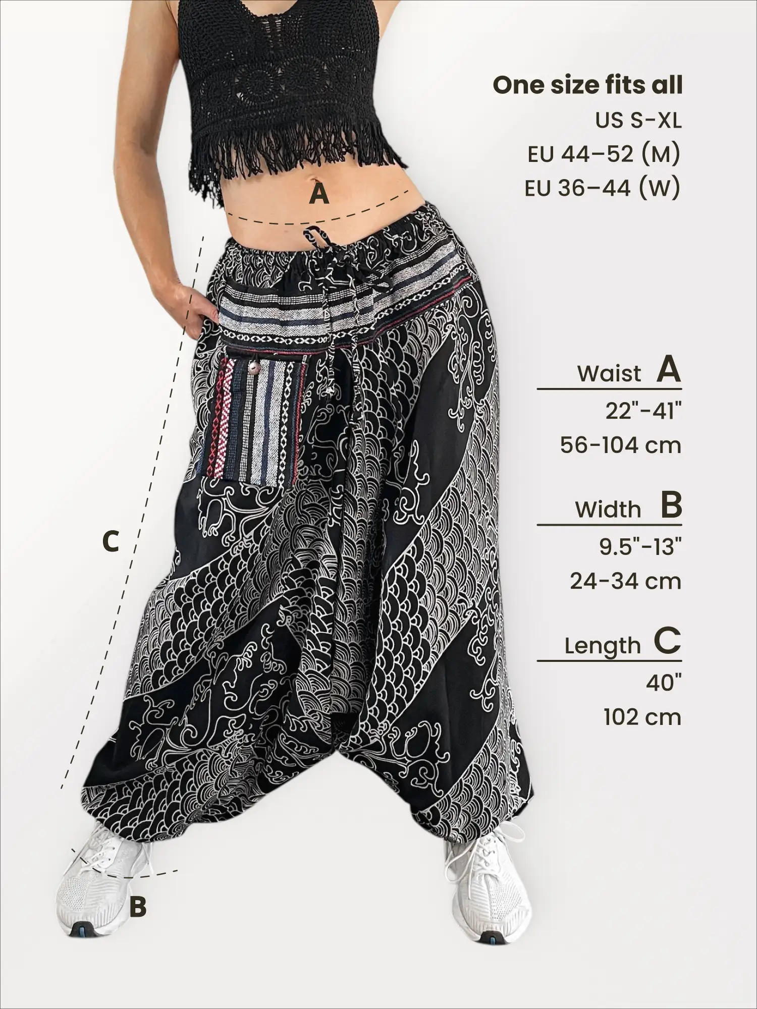 A stylish and practical detail is the side pocket, crafted from a contrasting patterned fabric and secured with a button, perfect for keeping your small items safe while you move. The deep drop-crotch design provides unparalleled freedom for any activity, from meditation to urban exploration. Embrace a timeless pattern with a modern, free-spirited fit. This one-size model fits a height range of 5’3″ to 6’3″ (approx. 160-190 cm).