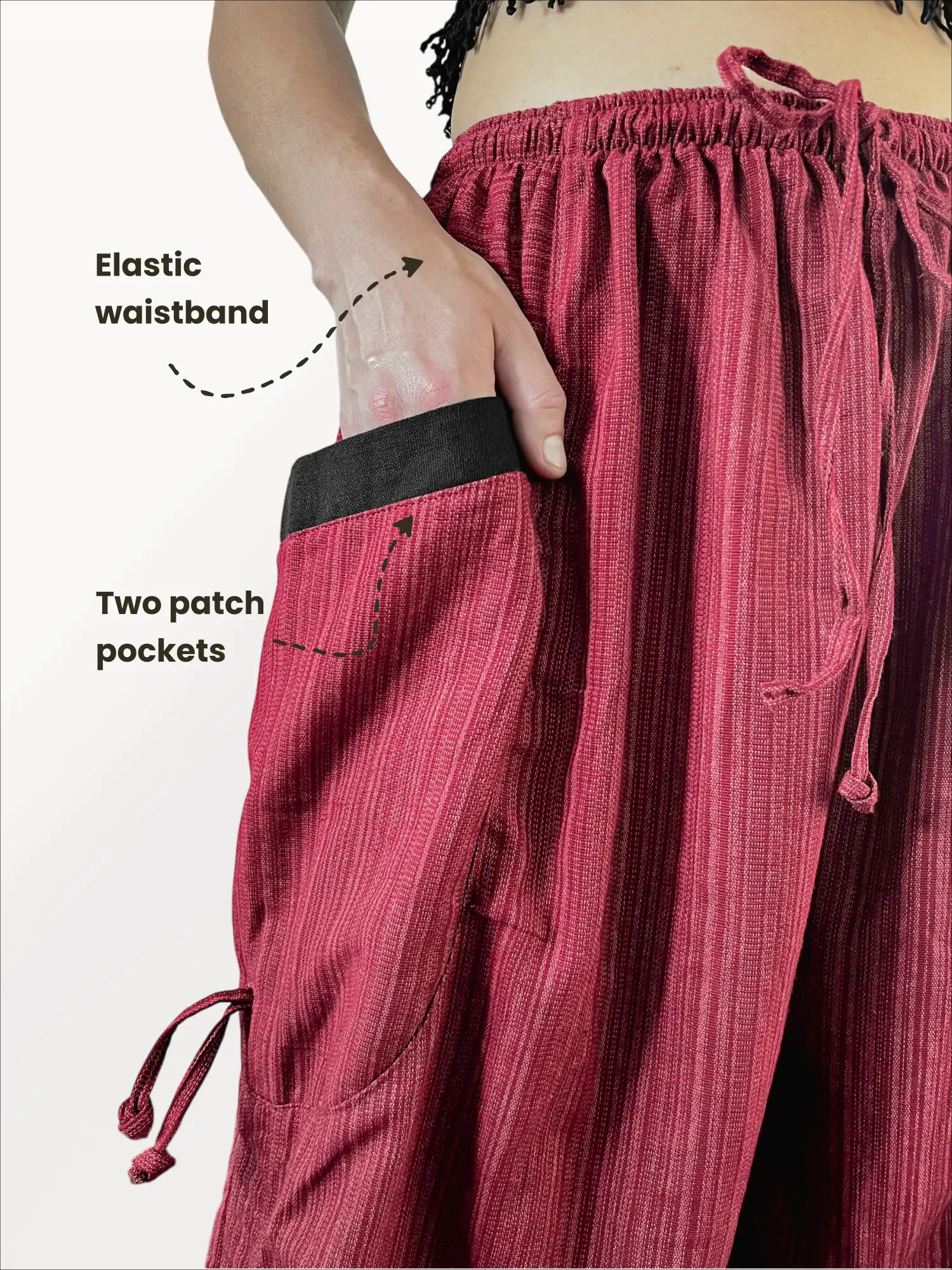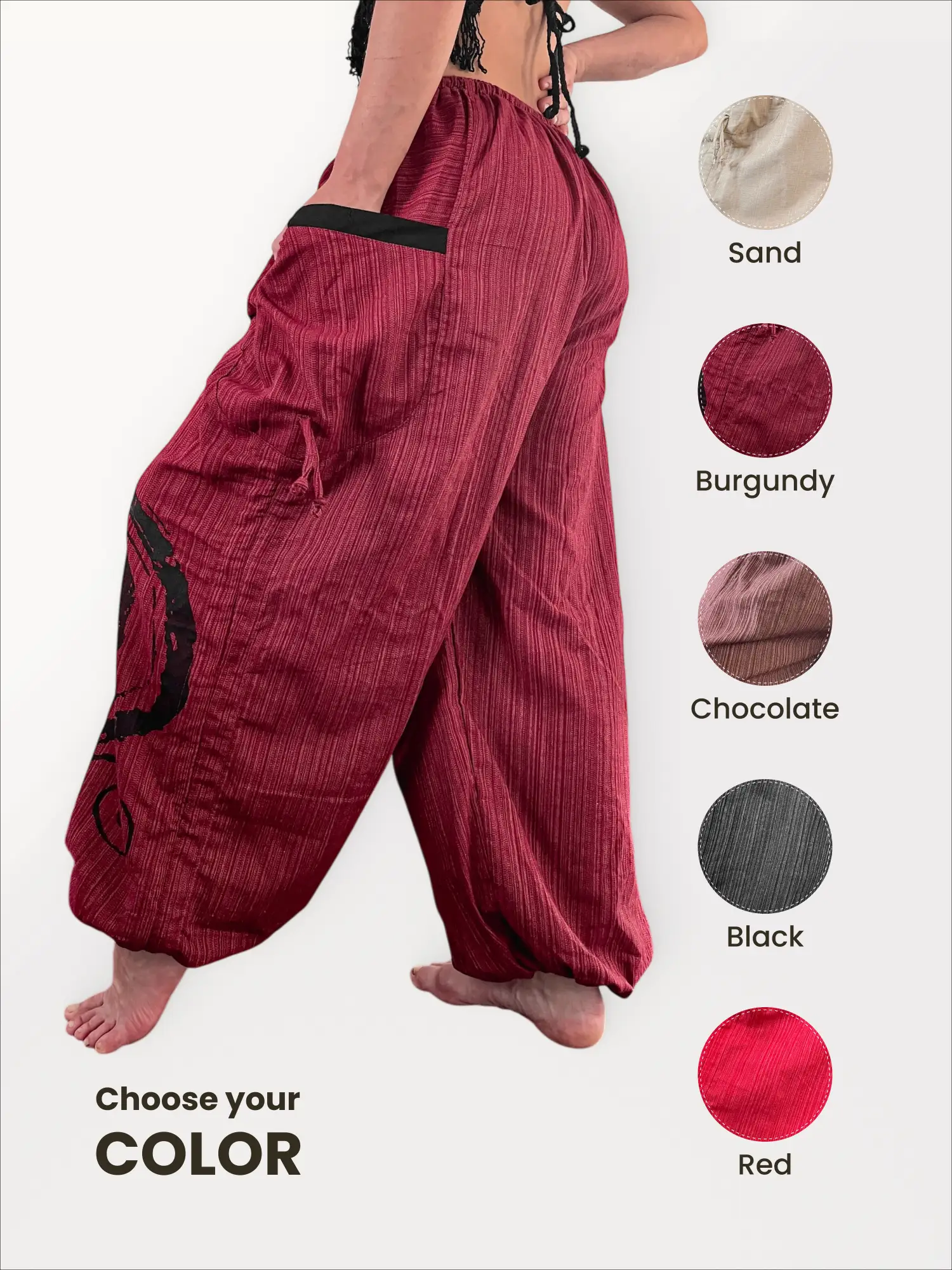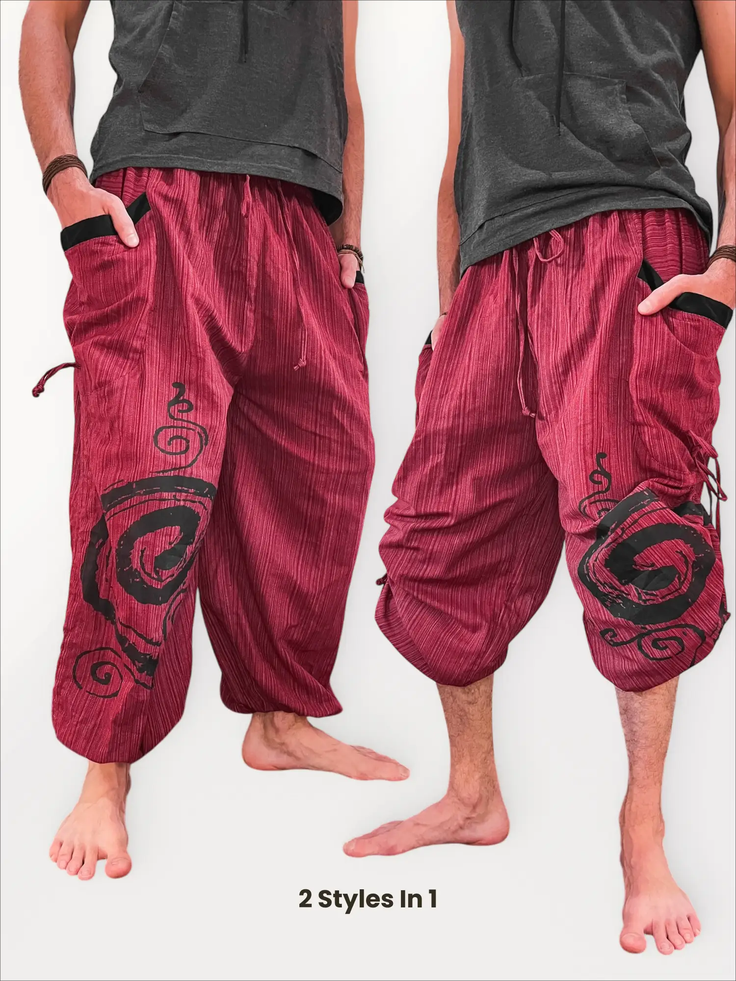 Embrace rich, earthy tones with the Bohemium Convertible Pants in Burgundy. These aren’t just pants; they’re your most adaptable travel companion. Made from high-quality stone-washed cotton, they have a comfortable, lived-in feel from the very first wear. The ingenious design features side drawstrings that let you easily convert them from long harem pants to comfortable shorts, making them perfect for changing weather and activities.