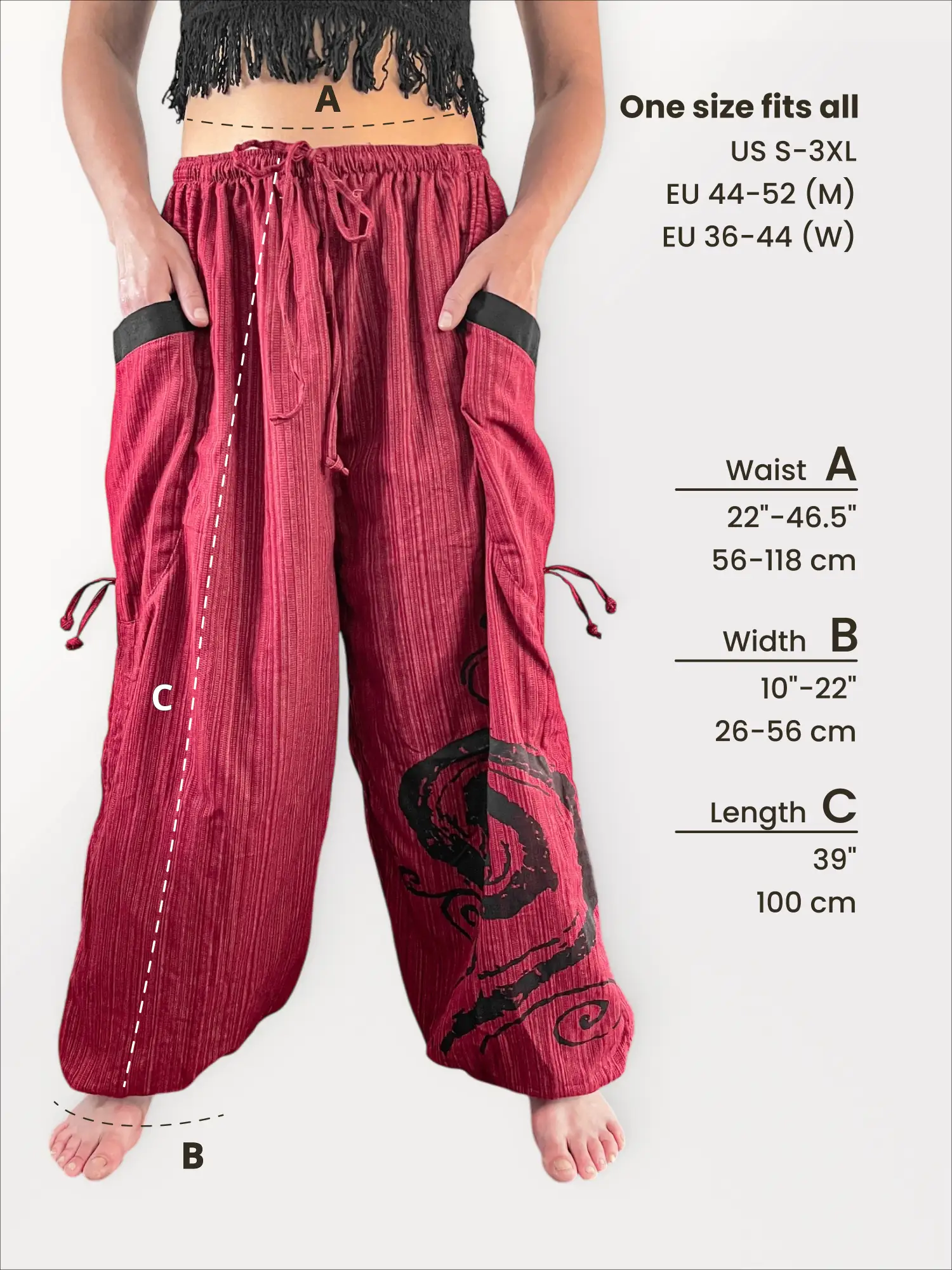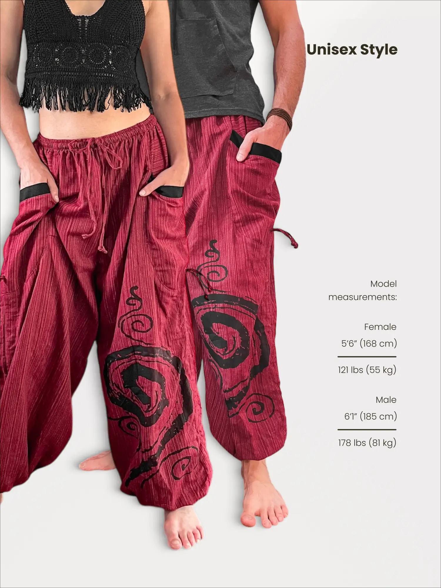 As the photos demonstrate, these unisex pants boast two large side pockets, a comfortable elastic waist with a tie, and a distinctive black spiral graphic on the leg. Whether you’re practicing yoga, hiking, or just exploring the city, these pants provide the freedom and functionality you need. This one-size model fits a height range of 5’3″ to 6’3″ (approx. 160-190 cm).