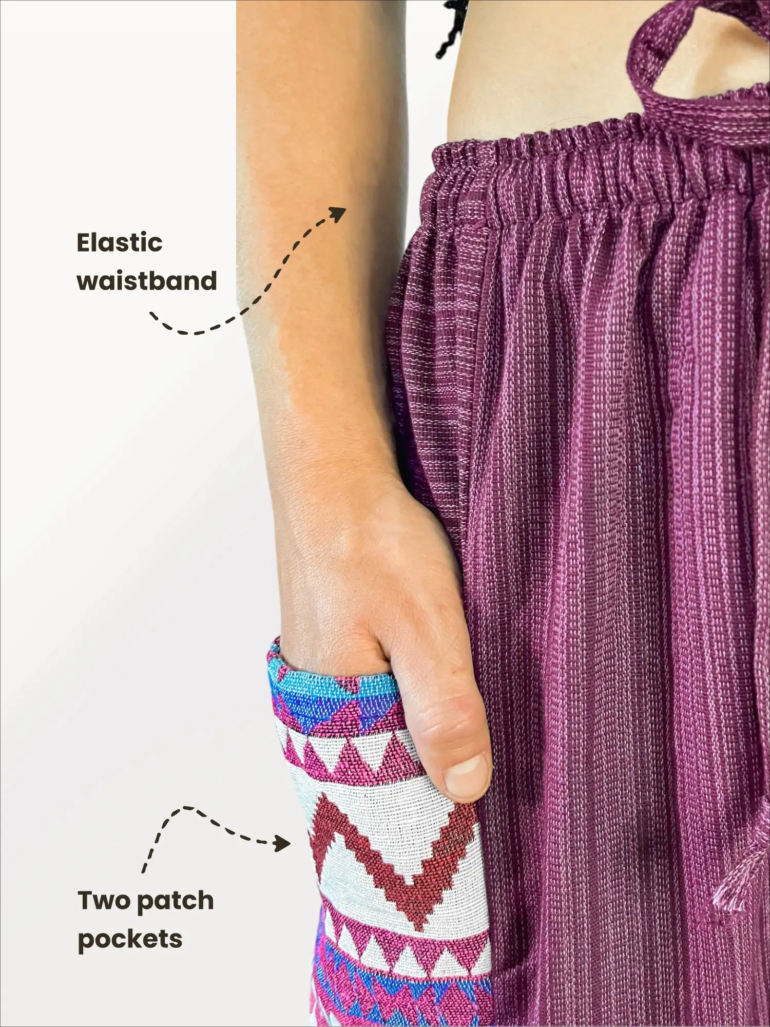 What makes these harem trousers special is the two deep side pockets, decorated with a geometric pattern that beautifully complements the main color. As the model shows, they offer a flattering and relaxed fit, perfect for a walk in the park, a coffee run, or exploring a new city. This unisex, one-size model comfortably fits heights from 5’3″ to 6’1″ (approx. 160-185 cm).